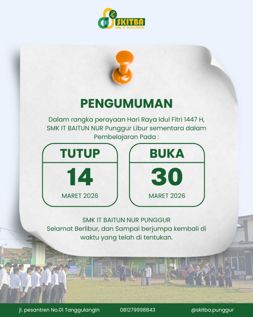 Selamat menikmati libur sekolah untuk Siswa/i SMK IT BAITUN NUR PUNGGUR, dengan libur ini semoga kita kembali dengan keadaan sehat, semangat, dan lebih baik kembali dalam melaksanakan pembelajaran.titip salam untuk orang tua kalian di rumah, dan selalu bilang kami merindukan kalian kembali di sekolah ini. Terima kasih
